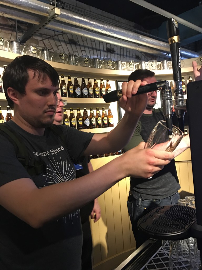 If the spire towered over the northern half of the city, the Storehouse dominated the southern half. The Guinness Brewery was an entire massive campus, but where tourists go is the visitor center of sorts. We scheduled our tour time at the same time Danielle’s friend and her cousin had scheduled theirs, and the extra company was quite welcome to keep us motivated through our tiredness. It was an unguided walking tour which gradually worked its way up to a skydeck bar at the top, each level of the tour covering a different aspect of Guinness, including its history, the brewing process, and everyone’s favorite, the sampling center and pouring tutorial.